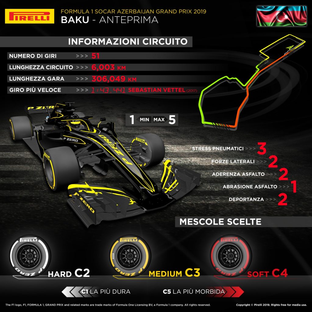 Mario Isola, responsabile Car Racing Pirelli, ha affermato: “La sfida maggiore a Baku è quella di trovare il giusto bilanciamento tra asse anteriore e posteriore in modo da far lavorare i pneumatici nella corretta finestra d’utilizzo. È un circuito piuttosto vario, con un rettilineo lungo quasi due chilometri e alcune curve molto tecniche. I periodi di safety car, sempre possibili su questo tracciato, possono diventare un’opportunità in ottica strategica. Le tre mescole nominate, C2, C3 e C4, dovrebbero adattarsi al meglio alle caratteristiche di questo tracciato, dove si svolge una delle gare più difficili da prevedere. È il circuito cittadino più insolito, con velocità elevate e il secondo giro più lungo dell’anno”.