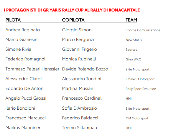 GR Yaris Rally Cup parte dunque con un palcoscenico importante, sotto i riflettori di prima scena, attesissima dal pubblico di appassionati, dagli addetti ai lavori ed anche da coloro che saranno i protagonisti, i quali non vedono l’ora di sfidarsi lungo tutta la stagione, composta da cinque avvincenti appuntamenti. Al Rally di RomaCapitale i trofesti iscritti sono 11.