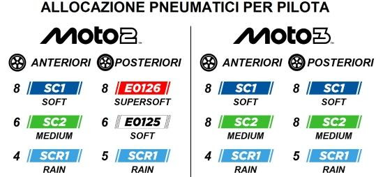 Laddove la Moto2 potrà contare su due soluzioni di sviluppo posteriori, in Moto3 i piloti potranno fare affidamento sull’allocazione standard composta da soft SC1 e medium SC2 per entrambe gli assi che già hanno dimostrato ottime prestazioni per tutta la stagione.