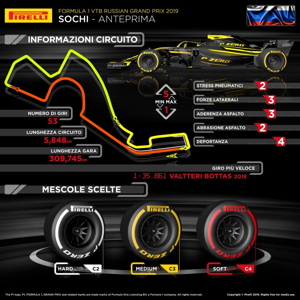 Per il Gran Premio di Russia, Pirelli ha nominato White hard C2, Yellow medium C3 e Red soft C4: le tre mescole a metà gamma, chiamate ad affrontare l’asfalto piuttosto liscio di Sochi. La nomination è più dura di uno step rispetto al 2018 e rispetto alla gara di Singapore della scorsa settimana.