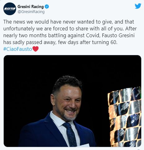 Lo annuncia online il team Gresini Racing alle 10:34: “La notizia che non avremmo mai voluto dare e che purtroppo siamo costretti a condividere con tutti voi: dopo quasi due mesi di battaglia contro il Covid, Fausto Gresini purtroppo se ne è andato, pochi giorni dopo aver compiuto 60 anni. #Ciao Fausto.”