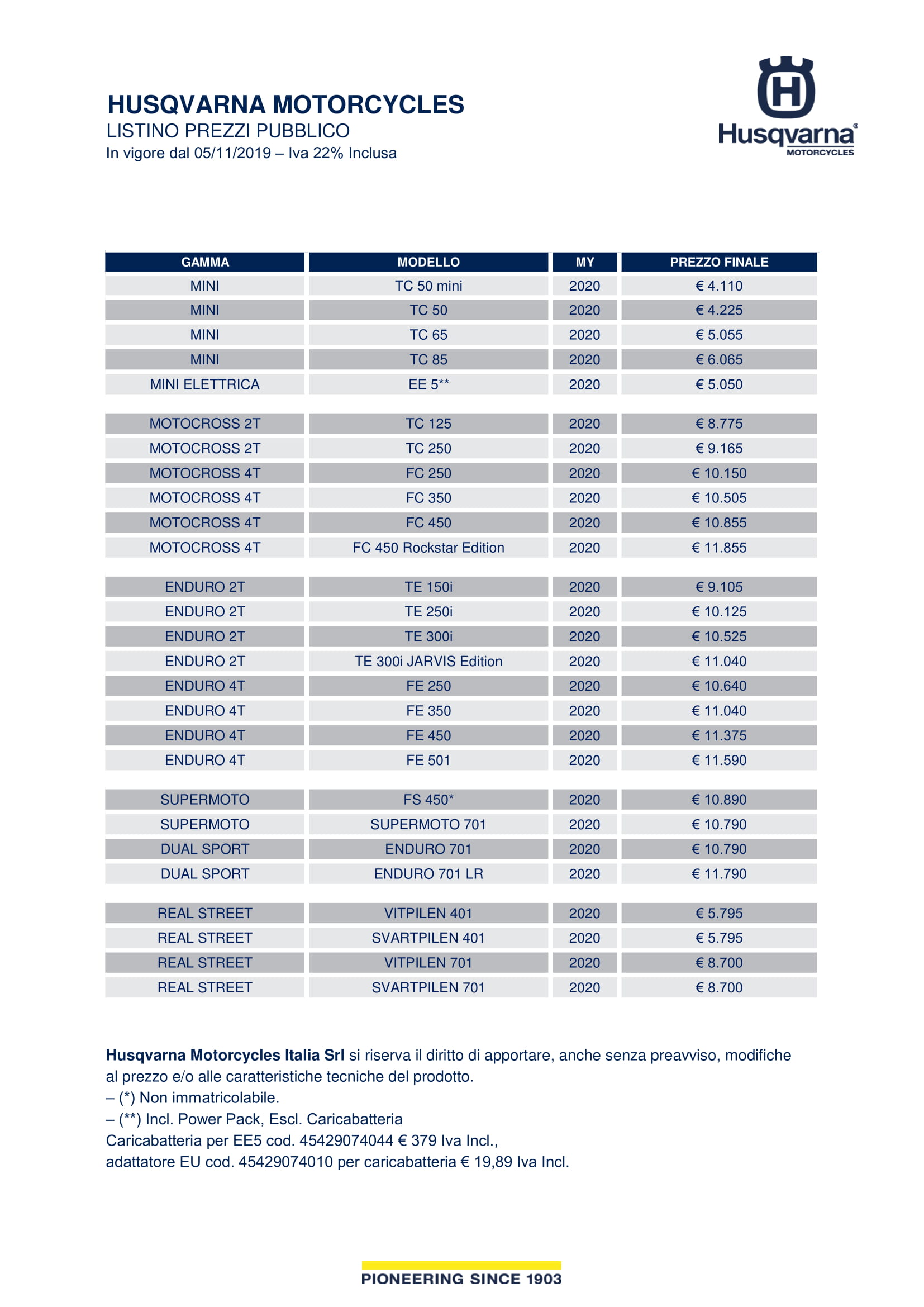 A seguito del Salone EICMA di Milano e della presentazione degli ultimi modelli della gamma 2020, Husqvarna Motorcycles ha comunicato i nuovi prezzi del listino 2020.