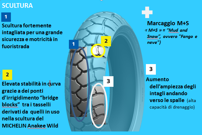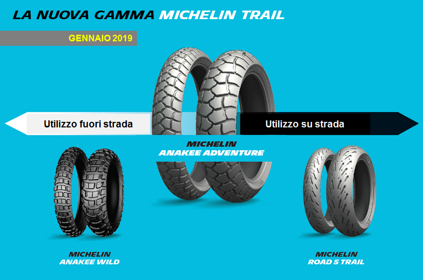 Questo nuovo pneumatico, riveste un ruolo fondamentale inserendosi e completando la nostra offerta dedicata alle Enduro stradali che vanta già i pneumatici Michelin Road 5 Trail (100% strada) e il Michelin Anakee Wild (50% strada e 50% fuoristrada).
