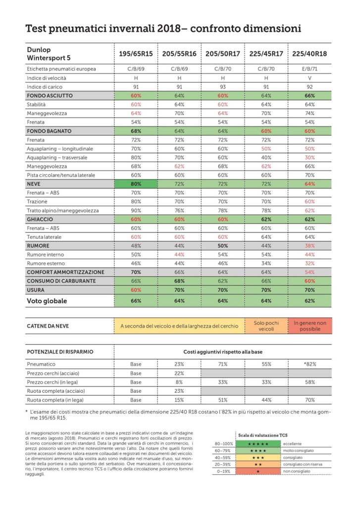 Le differenze emerse tra i pneumatici delle varie dimensioni, prese nella loro globalità, sono minime; per contro, prese singolarmente risultano a volte sensibili. Su fondo stradale innevato, le gomme più piccole e più strette hanno ottenuto risultati migliori per la trazione e la maneggevolezza; inoltre, il pericolo d’aquaplaning, per forte pioggia e per poltiglia di neve, è minore rispetto ai pneumatici più larghi. Queste gomme primeggiano anche nel prezzo d’acquisto, nel confort, rumore e consumo. I pneumatici invernali più piccoli si logorano più rapidamente rispetto alle gomme larghe, mentre la distanza di frenata sulla neve non cambia molto in funzione delle dimensioni. Il pneumatico più grande, ossia il modello da 18 pollici, ha battuto quello più piccolo nelle prove sull’asciutto. La maggiore superficie d’appoggio e le fiancate più rigide aumentano la sicurezza di guida e migliorano le sensazioni al volante. Per contro, su fondo stradale innevato, questo pneumatico può essere raccomandato soltanto con riserva, visto che sono utilizzati sulla neve solo raramente e il costruttore non prevede il montaggio delle catene da neve.