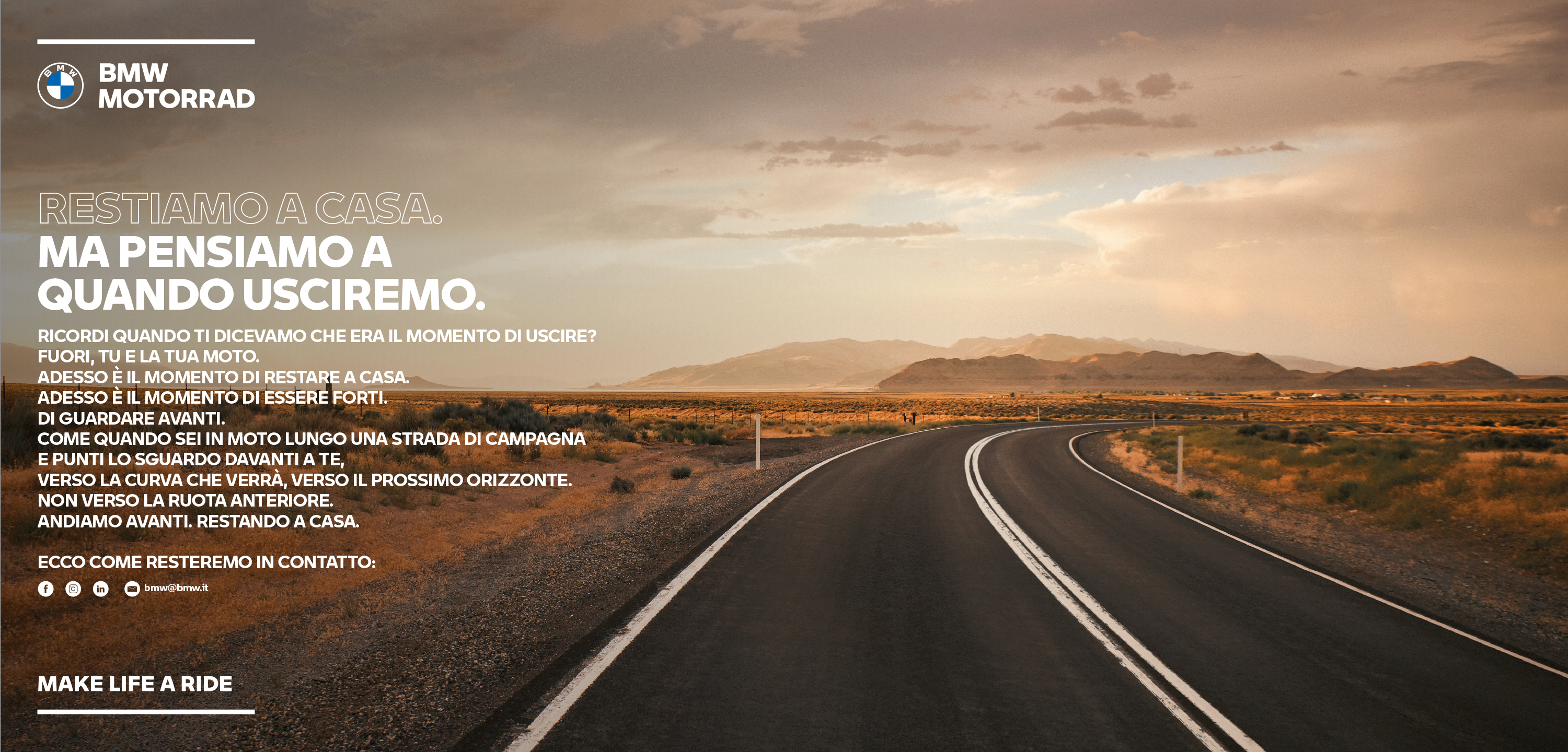 BMW Motorrad, sempre da venerdì 13, ha pubblicato sui propri canali social ufficiali (Facebook, Instagram, Twitter e LinkedIn) e sul proprio sito web nazionale un manifesto di responsabilità e di incoraggiamento rivolto ai propri clienti e fan, con il messaggio “Restiamo a casa. Ma pensiamo a quando usciremo”. Inoltre, sulle piattaforme social Instagram e Facebook, verranno invitati i follower a condividere i propri momenti speciali vissuti in sella e cosa faranno con la propria moto dopo il periodo di emergenza sanitaria.