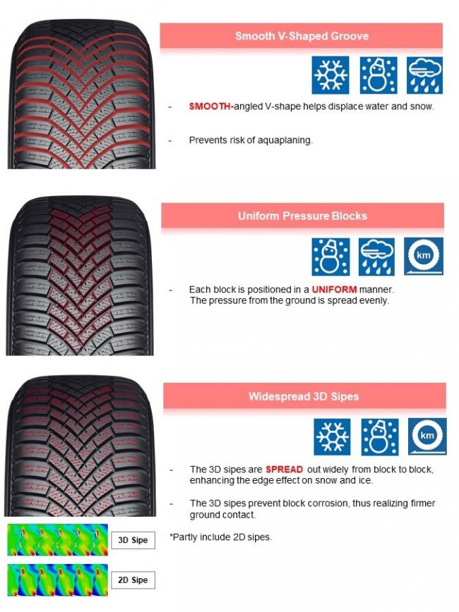Il disegno del battistrada del nuovo pneumatico BluEarth*Winter V906 si basa invece sul concetto di “Harmony Tread Design” ed è stato progettato con scanalature, blocchi e lamelle inserite in un layout armonioso per migliorare le prestazioni. Le scanalature lisce a V hanno un comportamento efficace in caso di neve e acqua, mentre i blocchi “a pressione uniforme” distribuiti con equilibrio e armonia sull’intero battistrada aumentano la rigidità del pneumatico per offrire ottime prestazioni di aderenza su tutte le superfici stradali invernali. Le ampie lamelle 3D, posizionate in modo ottimale, hanno invece l’obiettivo di migliorare le prestazioni su neve e ghiaccio.