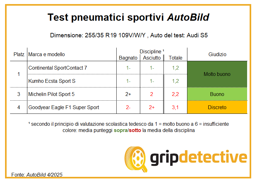 Ora, AutoBild è giunta più o meno alla stessa conclusione, pubblicando un recente test pneumatici in cui il nuovo Kumho è stato messo alla prova contro, per l’appunto, il Continental SportContact 7, il Michelin Pilot Sport 5 e il Goodyear Eagle F1 Super Sport. La misura utilizzata per la prova è stata la 255/35 R19 e l’auto una Audi S5.