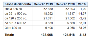 Mercato elettrico – Malgrado l’esaurimento anticipato degli incentivi, che provoca una flessione del 41,93% del mercato elettrico (nel mese di dicembre soli 777 veicoli venduti), l’anno registra 10.753 mezzi a emissioni zero immessi sul mercato, corrispondenti ad un significativo incremento del 84,54% rispetto al 2019. Il rinnovo degli incentivi approvato in Legge di bilancio lascia prevedere un’ulteriore espansione di questo settore nel 2021. Di seguito l’analisi dettagliata del mercato di motocicli e scooter per fasce di cilindrata e segmento e la top 10 delle due ruote più vendute nel 2020.