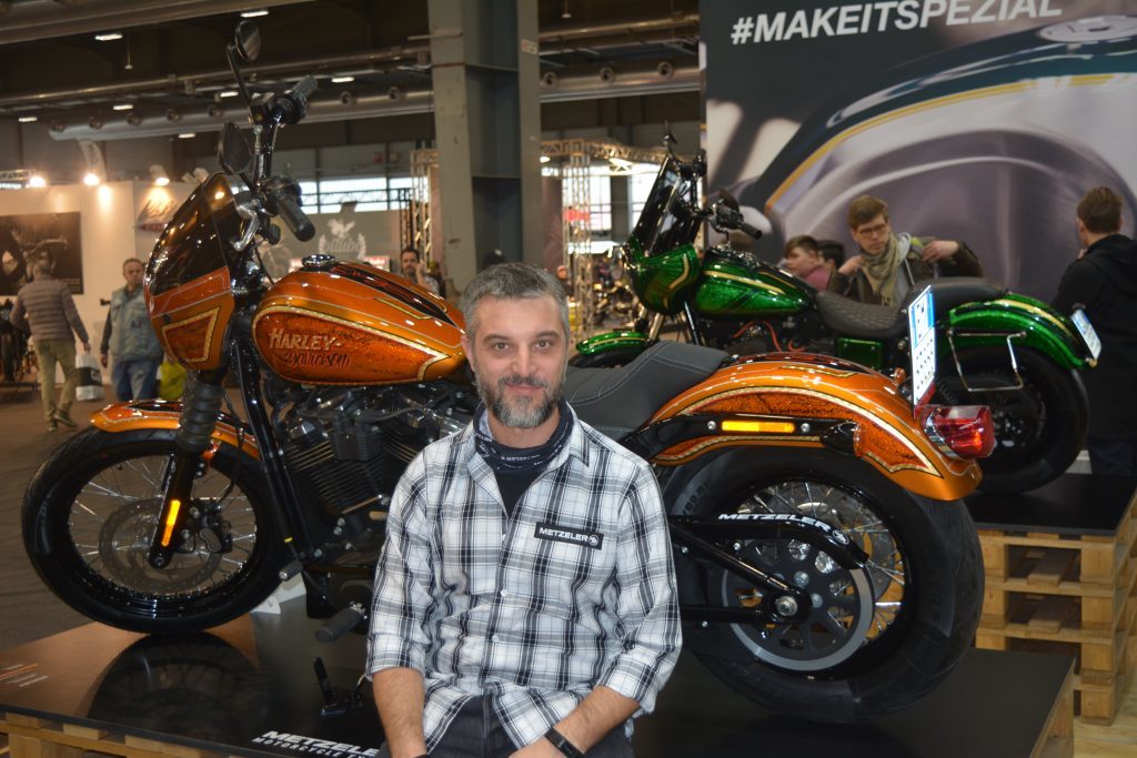 Daniele Maletti, marketing manager moto Pirelli, con, sullo sfondo, l’Harley di Max Pezzali, testimonial Metzeler nella serata veronese di MBE