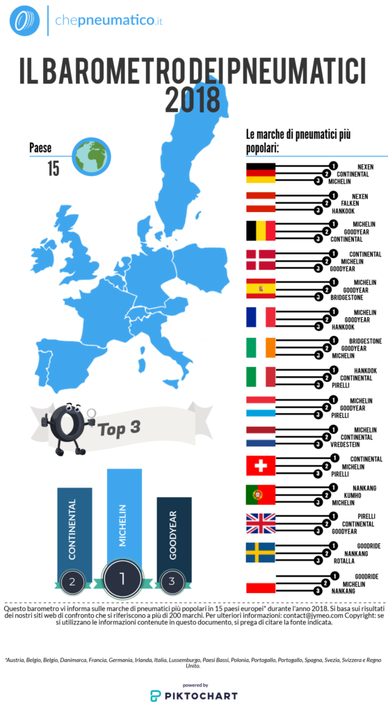 Nel nostro Paese la classifica è vinta da Hankook, con il secondo posto occupato da Continental e il terzo da Pirelli. La casa coreana sarà sicuramente soddisfatta di questo risultato: si tratta dell’unico successo in classifica, con 2 altri podi in Francia e Austria. Per Pirelli, invece, oltre al podio in casa, altri due terzi posti in Lussemburgo e Svizzera e la vittoria nel Regno Unito.