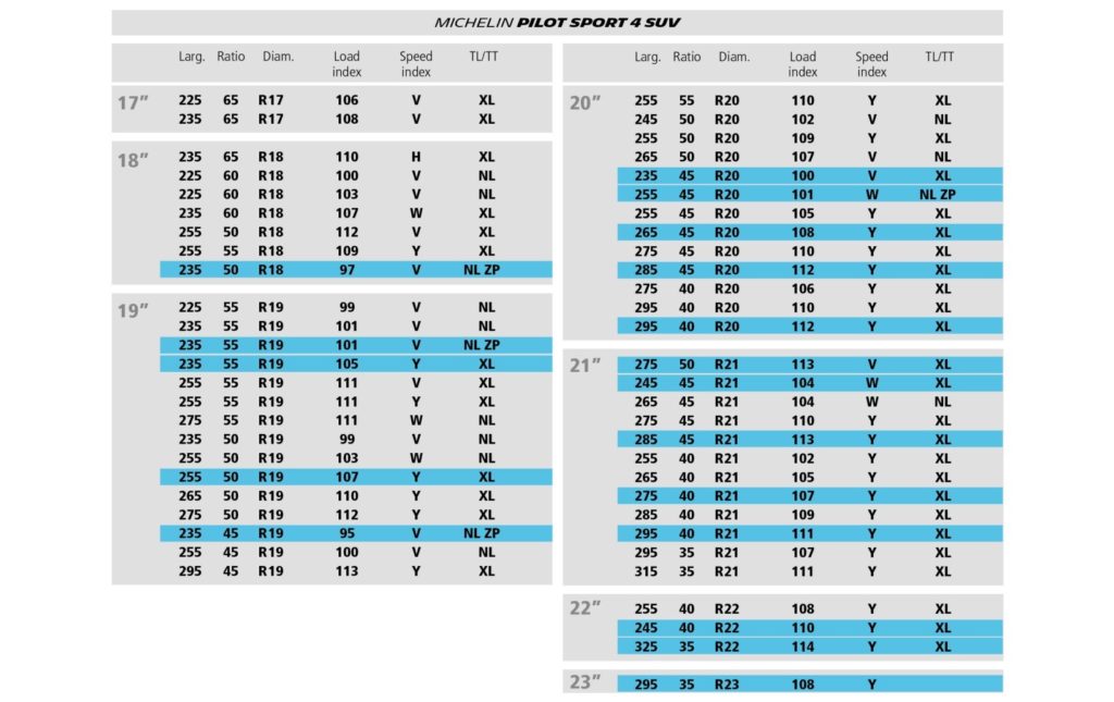 Il nuovo pneumatico Michelin Pilot Sport 4 SUV sarà disponibile in 53 dimensioni nel 2019, di cui 18 sono nuove offerte, ovvero dimensioni nelle quali non esisteva alcuna offerta Michelin (SUV e vettura) fino ad oggi con la stessa tecnologia (standard o runflat).