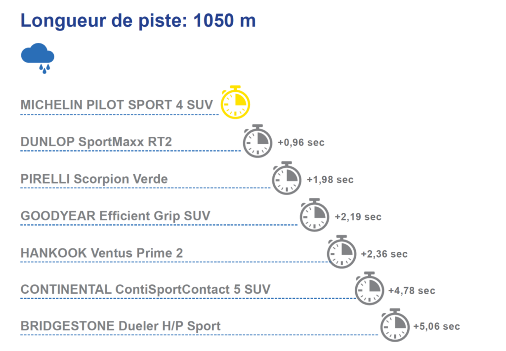 Su un circuito per il comportamento sul bagnato di 1050m di lunghezza, il pneumatico Michelin Pilot Sport 4 SUV è più veloce di 2,88 secondi rispetto alla media dei suoi concorrenti.