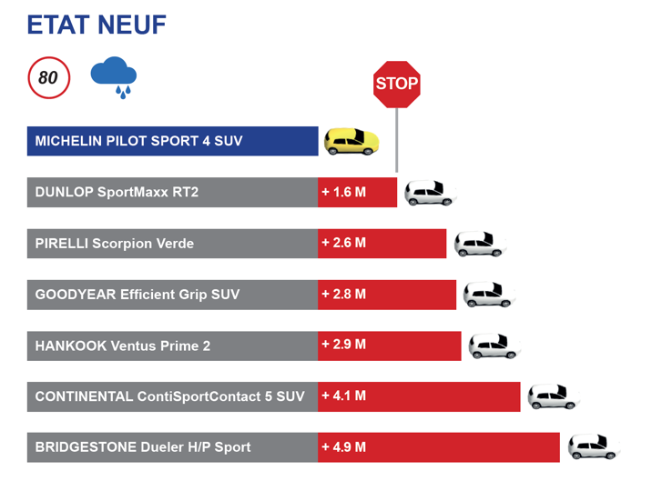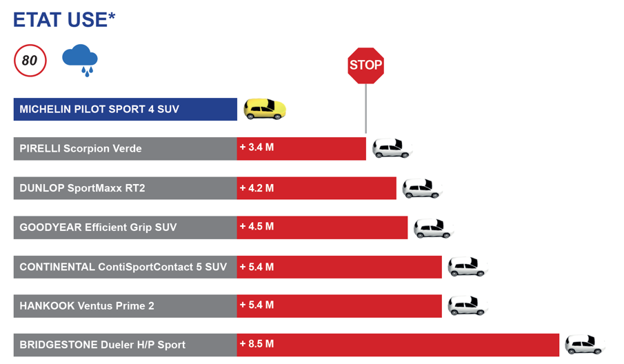 Su suolo bagnato, da nuovo, si ferma 3,15 metri prima della media dei suoi concorrenti. Questa differenza aumenta quando il pneumatico è usurato, in questa condizione, la distanza di frenata del pneumatico Michelin Pilot Sport 4 SUV è di 5,2 metri minore rispetto