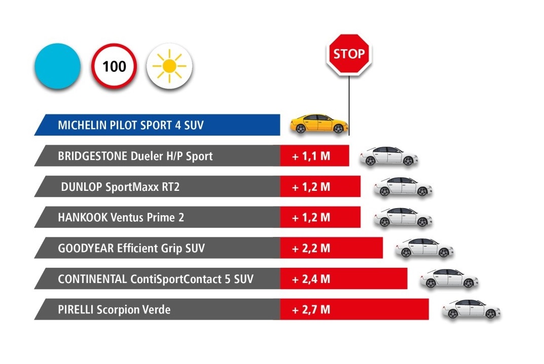 Il pneumatico Michelin Pilot Sport 4 SUV precede i suoi concorrenti in frenata su suolo asciutto e bagnato. I test effettuati dal TÜV SÜD hanno dimostrato che su asciutto, il Michelin Pilot Sport 4 SUV frena prima, con una distanza di frenata minore di 1,8 metri rispetto alla media dei suoi concorrenti.