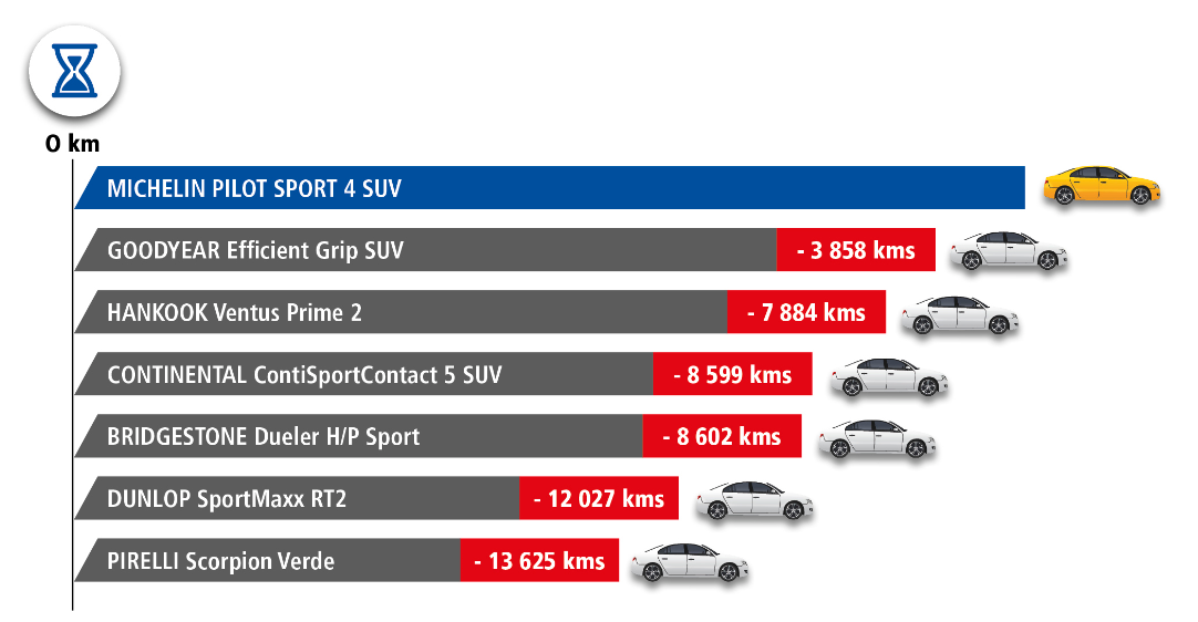 In termini di durata chilometrica, il pneumatico Michelin Pilot Sport 4 SUV precede i suoi principali concorrenti perché consente di percorrere 9100km in più rispetto alla media di questi ultimi.