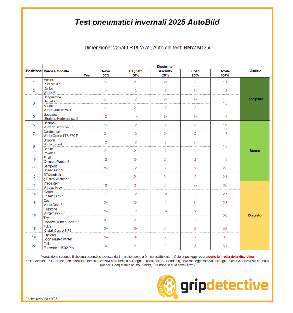 Per la stagione 2025, Auto Bild ha valutato 51 modelli nella misura 225/40 R18, una misura utilizzata da auto compatte ma scattanti come la VW Golf GTI & R, la Hyundai i30 N e la Mercedes-AMG A35: ecco la classifica delle migliori gomme invernali del 2025 2026.
