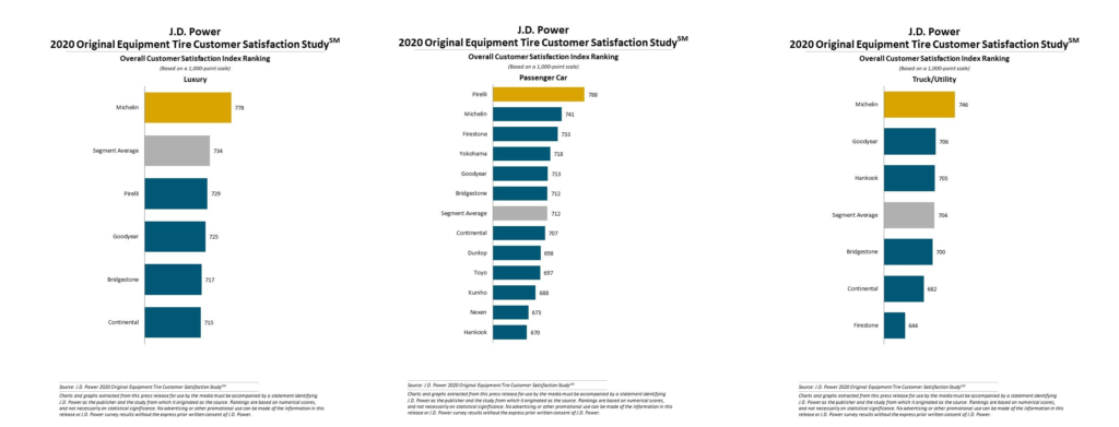 Completano il podio Pirelli e Goodyear nella categoria lusso, con 729 e 725 punti rispettivamente. Nelle vetture standard, invece,vicino a Pirelli ci sono Michelin e Firestone, con 741 e 733 punti. Nel segmento truck/pick-up, molto importante in USA, a seguire Michelin sono Goodyear e Hankook.