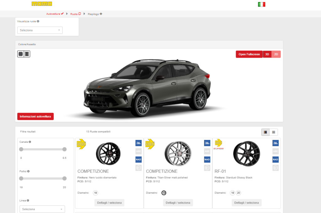 Il database del configuratore MOMO è già tra i più completi del settore: sono disponibili più di 2.000 modelli, coprendo un ampio ventaglio di marchi e segmenti, dalle compatte alle sportive, fino ai SUV di ultima generazione. Un catalogo destinato ad ampliarsi costantemente.