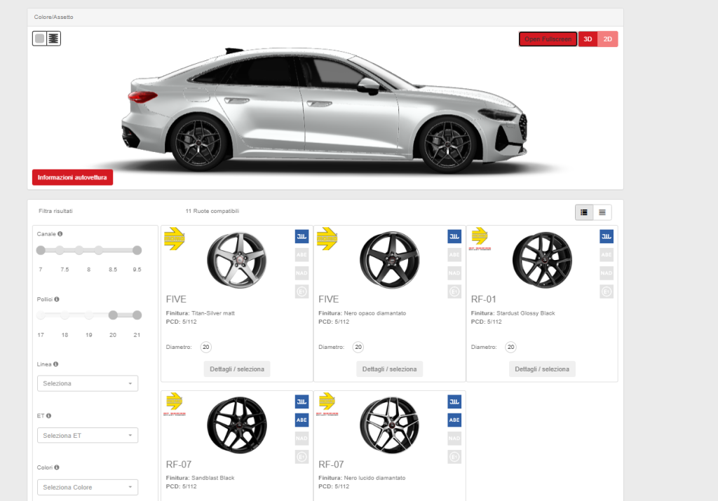 Uno dei punti di forza della piattaforma è la disponibilità dei colori ufficiali delle case automobilistiche: questo permette di verificare l’abbinamento cromatico tra carrozzeria e cerchi con la massima precisione, evitando sorprese al momento dell’installazione.