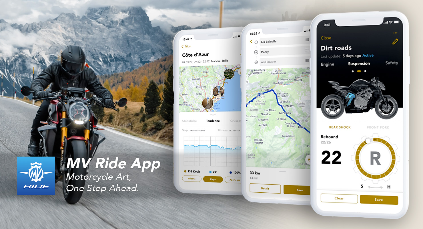 Brian Gillen, Head of Research & Development di MV Agusta Motor S.p.A. ha dichiarato: “Continua il nostro impegno a sostenere l’espansione della famiglia MV Agusta, favorendo inoltre lo sviluppo di rapporti al suo interno attraverso la nostra nuova piattaforma di connettività MV Ride. L’App fornirà agli utilizzatori l’accesso ad un nuovo livello di interazione con la loro moto e, ancor più importante, permetterà all’intera comunità MV Agusta di interagire e di condividere itinerari ed esperienze. Questo è solo l’inizio di un nuovo futuro nel quale questa piattaforma continuerà a crescere e si evolverà con nuove release.”