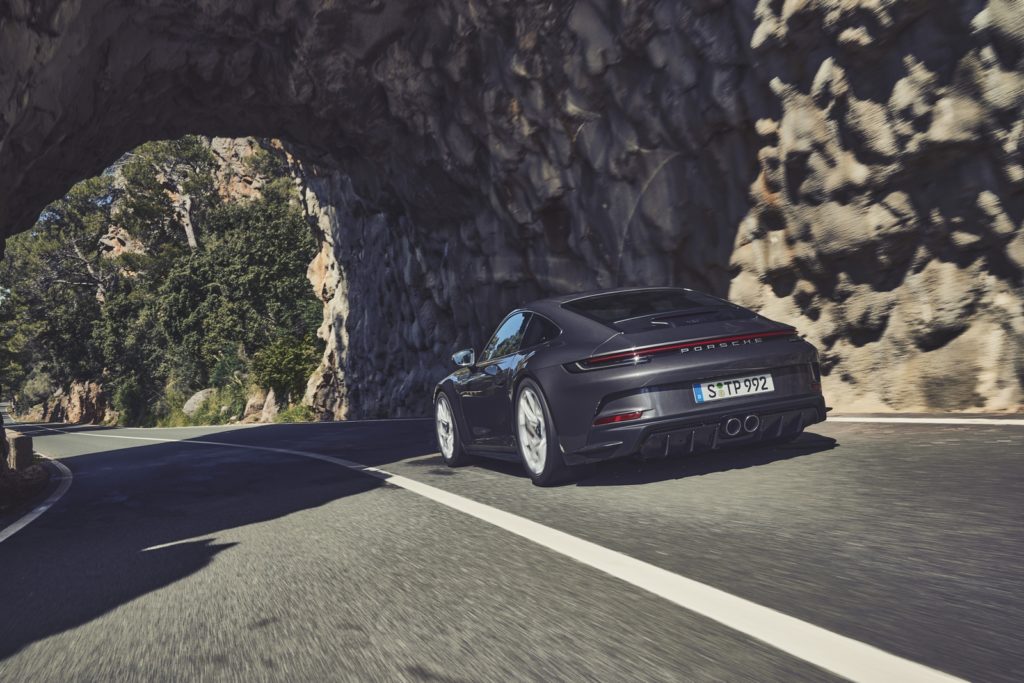 La differenza più evidente all’esterno è la mancanza dell’ala posteriore fissa della 911 GT3. In questo caso è uno spoiler posteriore ad estensione automatica che garantisce la deportanza necessaria alle alte velocità e contribuisce ulteriormente alla sobrietà della vettura.