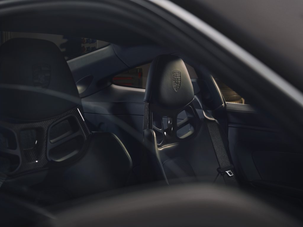 Le rifiniture color argento in alluminio anodizzato lucido sui finestrini laterali sono un altro tratto distintivo che sottolinea l’aspetto discreto della nuova arrivata. Il frontale è interamente verniciato nel colore della carrozzeria. Gli interni con ampie sezioni in pelle nera risultano particolarmente eleganti e sono disponibili esclusivamente per la GT3 con pacchetto Touring. La parte anteriore del cruscotto e le sezioni laterali superiori dei pannelli di rivestimento delle porte sono caratterizzate da una speciale goffratura superficiale.