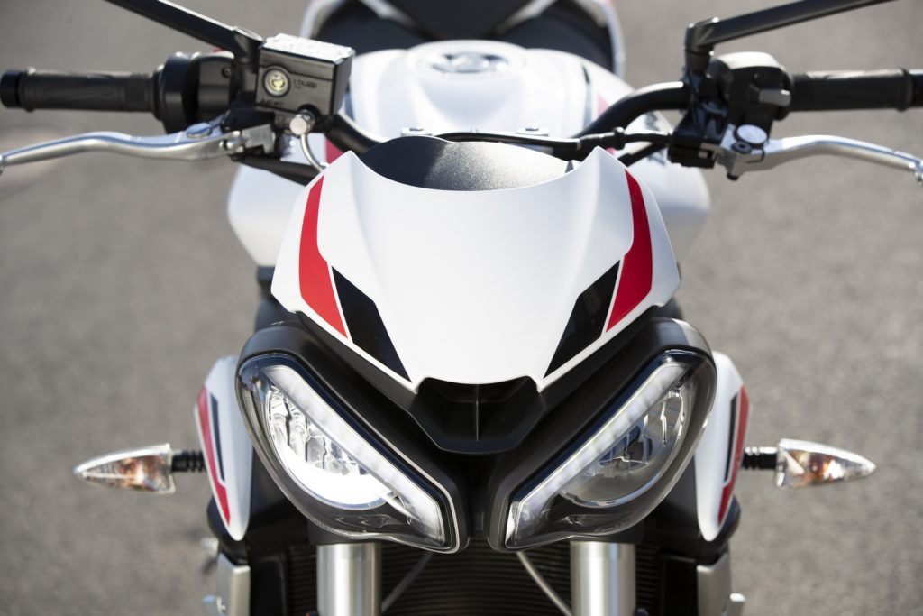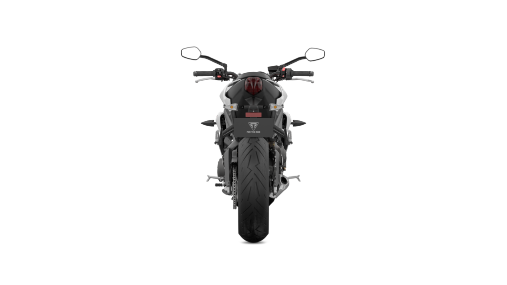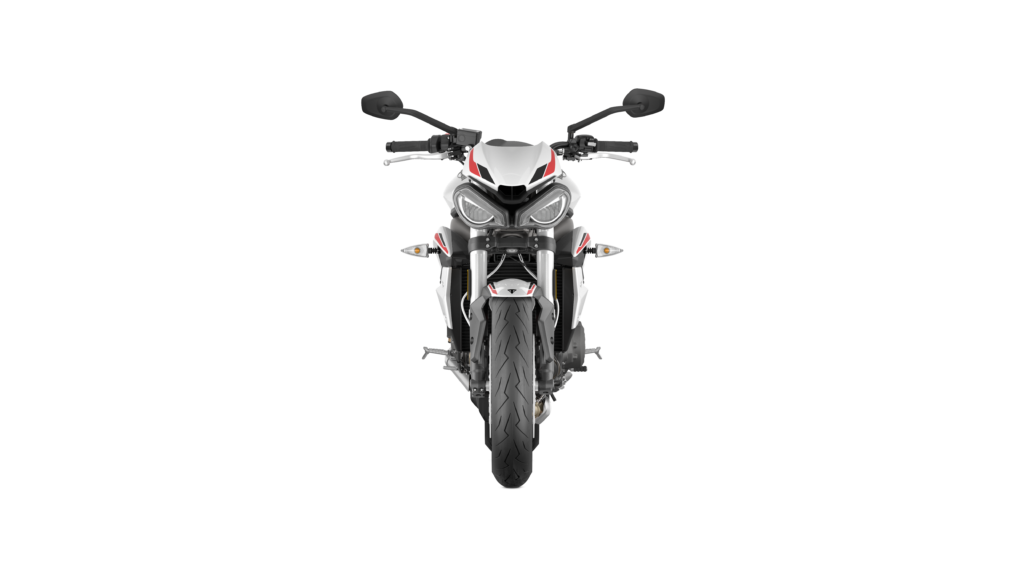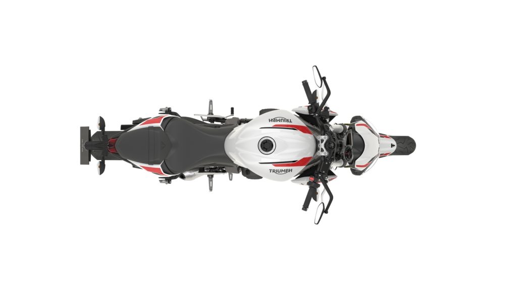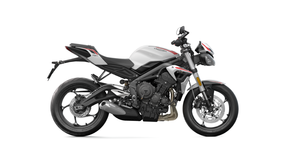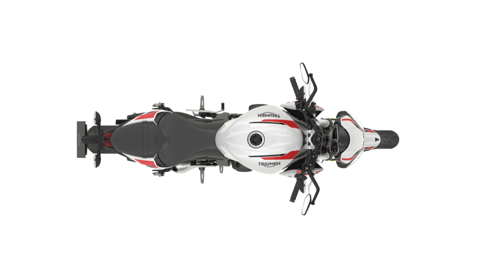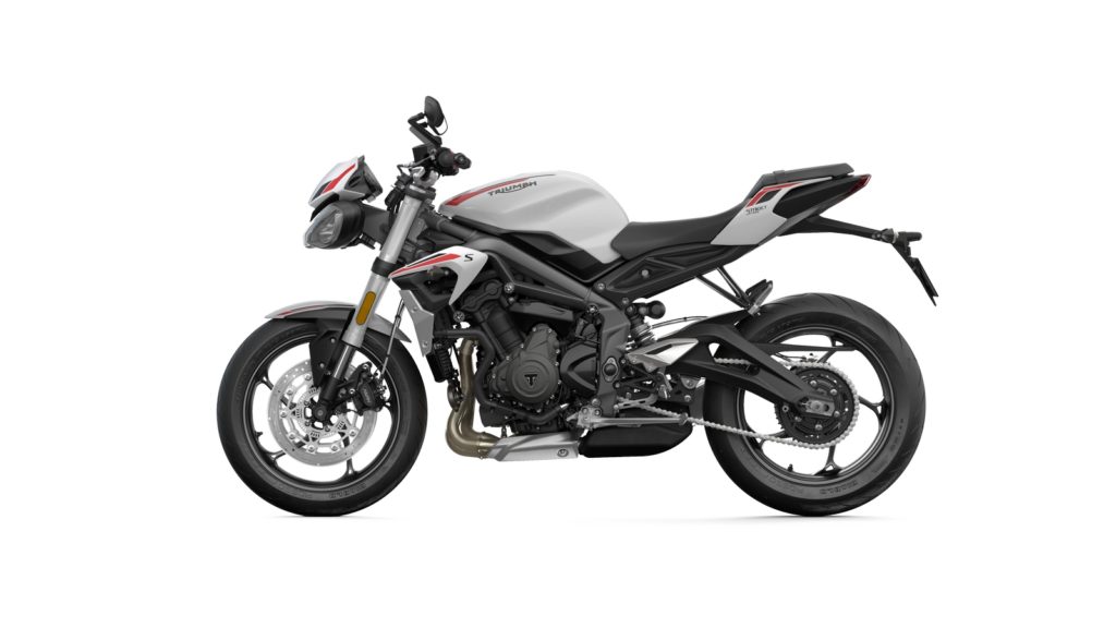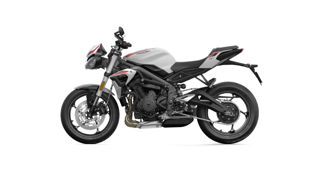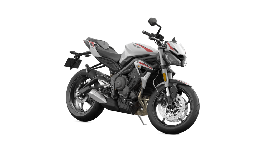 La nuova Street Triple S viene offerta in livrea Crystal White, con grafiche in Diablo Red e Black, badge sul serbatoio nero e telaietto posteriore nero.