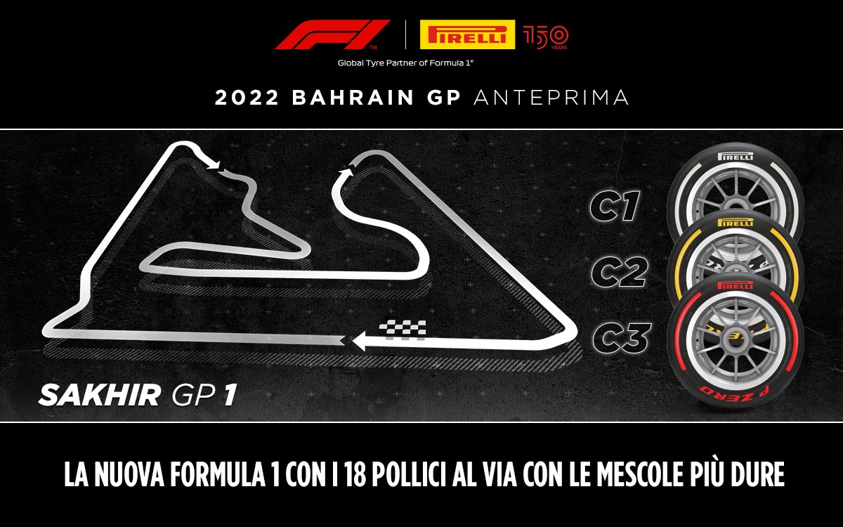 Per il Bahrain, Gran Premio di apertura della stagione, Pirelli ha selezionato le tre mescole più dure della nuova gamma di pneumatici da 18 pollici: la mescola C1 è la P Zero White hard, la C2 è la P Zero Yellow medium e la C3 è la P Zero Red soft. Questa nomination è uno step più dura rispetto alla selezione fatta per la gara dell’anno scorso perché i nuovi pneumatici da 18 pollici sono completamente diversi rispetto ai loro predecessori da 13, anche in termini di mescole.