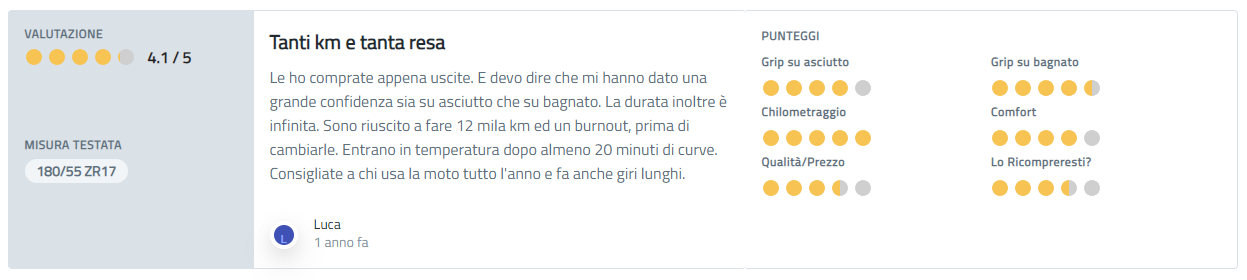 Le ho comprate appena uscite. E devo dire che mi hanno dato una grande confidenza sia su asciutto che su bagnato. La durata inoltre è infinita. Sono riuscito a fare 12 mila km ed un burnout, prima di cambiarle. Entrano in temperatura dopo almeno 20 minuti di curve. Consigliate a chi usa la moto tutto l’anno e fa anche giri lunghi.