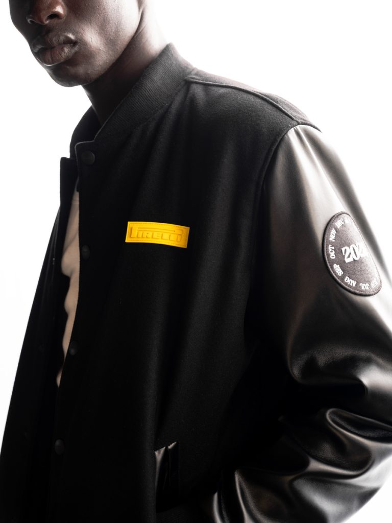 Dalla silhouette essenziale, la giacca Archive, realizzata con una miscela pregiata di lana ed eco-pelle, incarna durabilità e raffinatezza. La sua estetica minimale, conferita anche dal total black, è valorizzata da grafiche ricamate e dall’iconico giallo del logo PIRELLI.