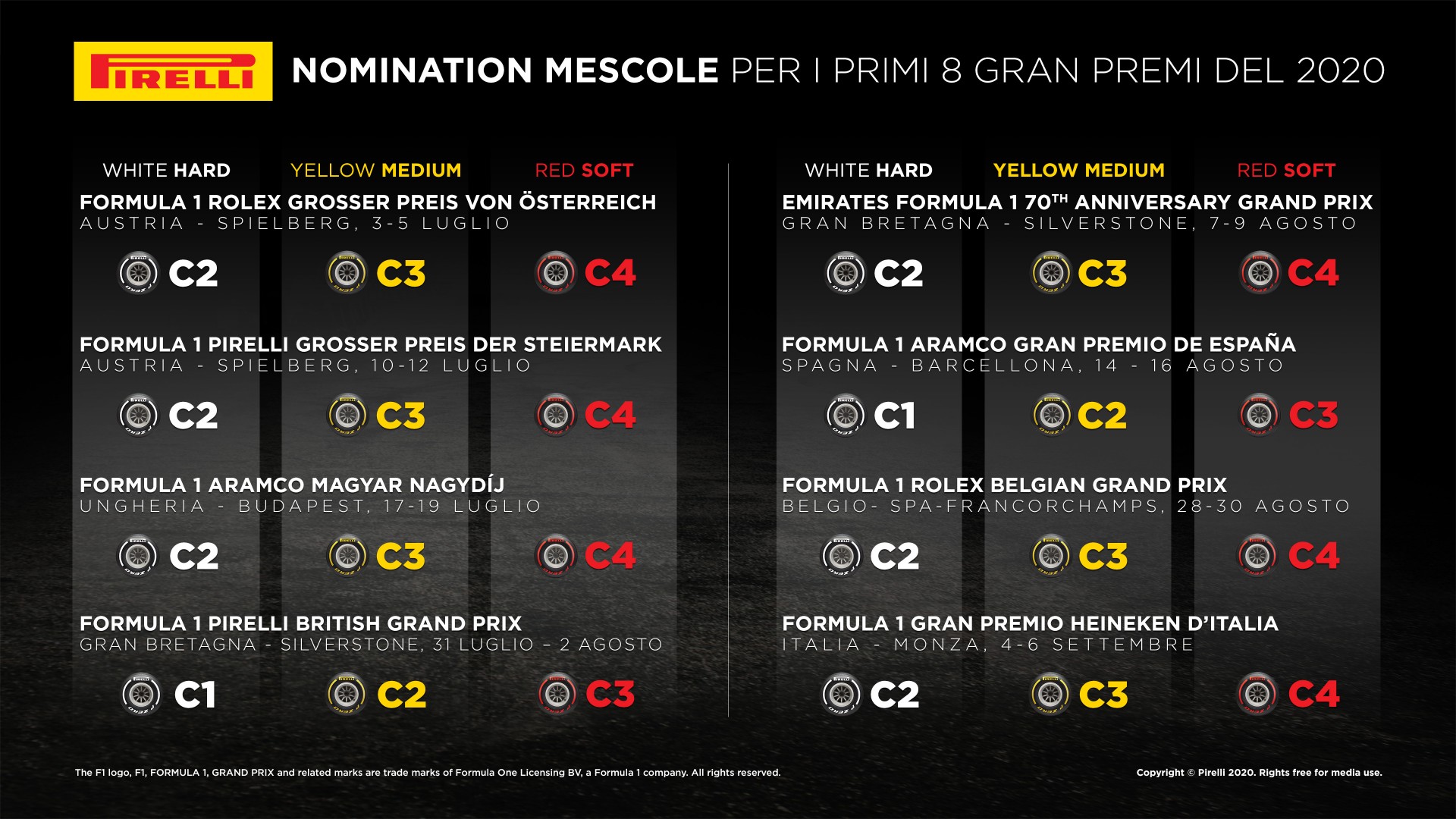 In seguito alla recente ufficializzazione della prima parte del calendario 2020, Pirelli annuncia le mescole dei pneumatici nominate per i primi otto Gran Premi della stagione di Formula 1 2020 in Austria, Ungheria, Gran Bretagna, Spagna, Belgio e Italia.