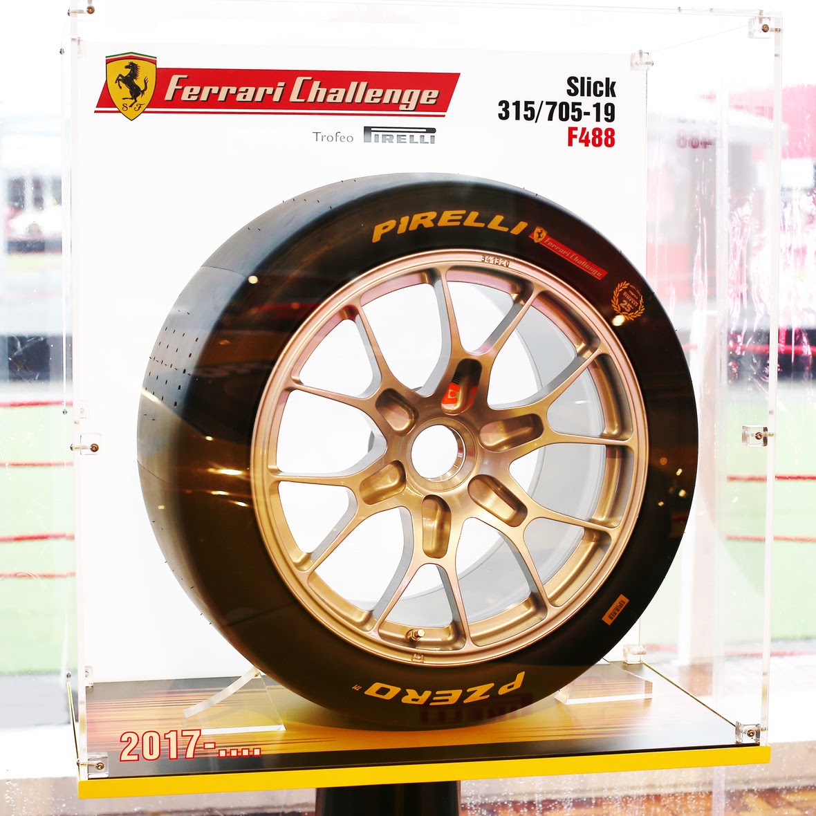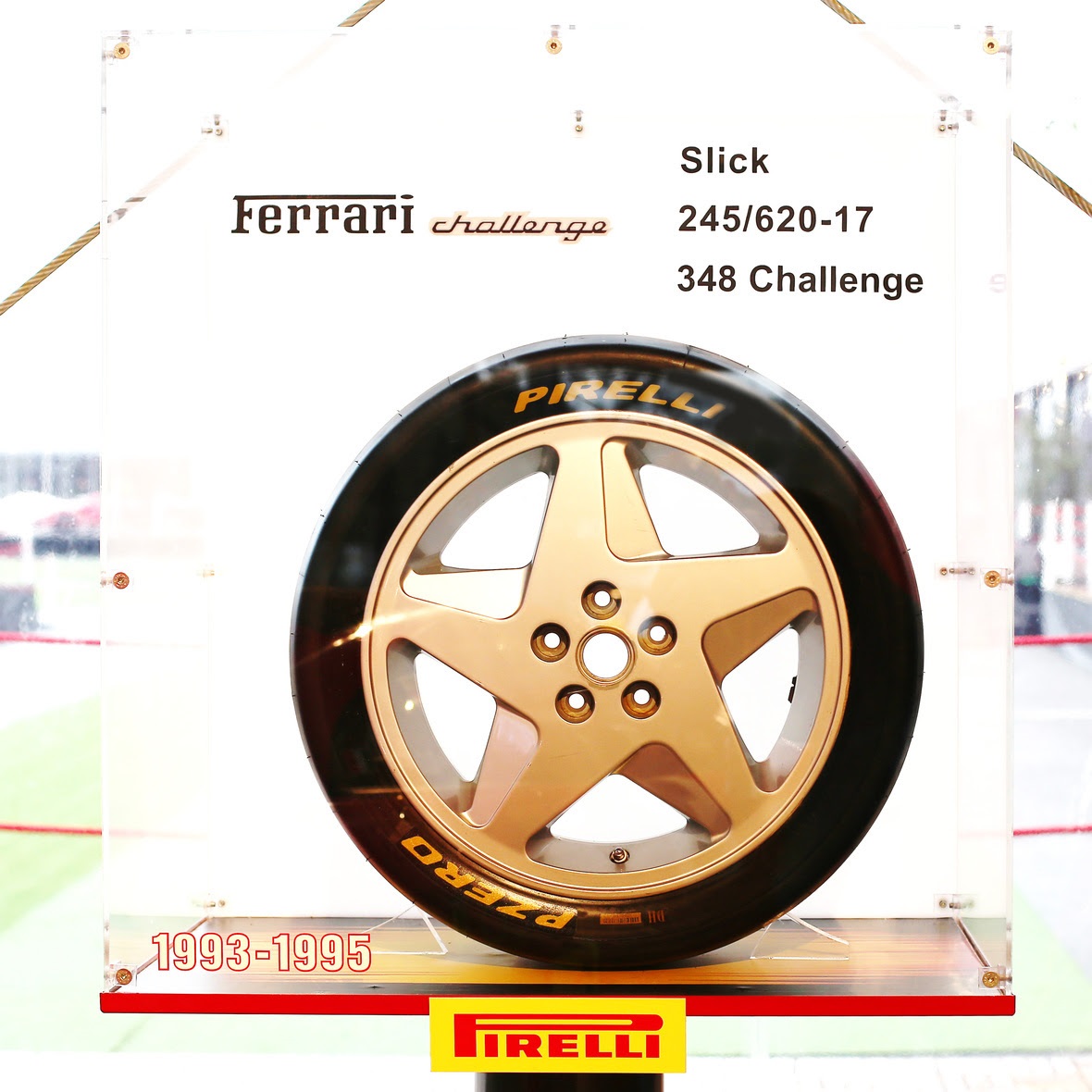 L’auto che ha inaugurato il monomarca è stata la Ferrari 348 Challenge. Derivava dalla 348 TB e TS del 1989, di cui manteneva il V8 da 3,5 litri e capace di erogare 320 CV. Rispetto alla versione stradale, la 348 Challenge era equipaggiata con un kit di cui facevano parte i pneumatici slick, sviluppati appositamente da Pirelli. Il primo pneumatico per il Ferrari Challenge era un 17” con misure differenziate fra anteriore e posteriore (245/620-17 e 265/640-17). Come l’auto, anche le gomme in qualche modo avevano un legame con i modelli stradali: per realizzarle, si usavano gli stampi dei P Zero di normale produzione ma con struttura e mescole dedicate.