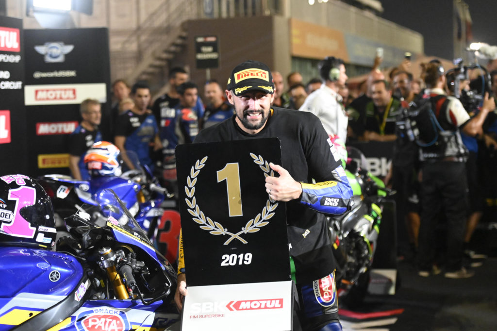 Jonathan Rea(Kawasaki Racing Team WorldSBK / Kawasaki ZX-10RR), Randy Krummenacher (Bardahl Evan Bros. WorldSSP Team / Yamaha YZF R6) e Manuel Gonzalez (Kawasaki ParkinGO Team / Kawasaki Ninja 400) sono i Campioni del Mondo 2019 rispettivamente nelle classi WorldSBK, WorldSSP e WorldSSP300.