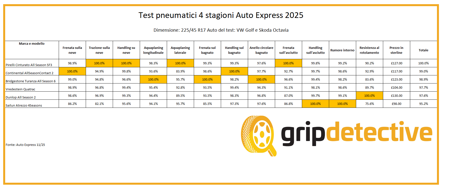 Il primo classificato nel test pneumatici all season 225/45 R17 di Auto Express, come nel 2024, è ancora una volta il Pirelli Cinturato All Season SF3, il pneumatico vincitore della nostra classifica 2025 2026 delle migliori gomme 4 stagioni.
