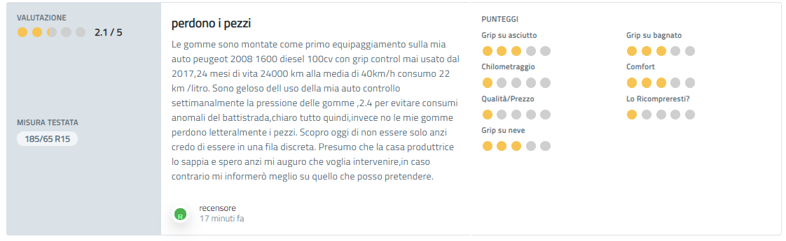 Le gomme sono montate come primo equipaggiamento sulla mia auto peugeot 2008 1600 diesel 100cv con grip control mai usato dal 2017,24 mesi di vita 24000 km alla media di 40km/h consumo 22 km /litro. Sono geloso dell uso della mia auto controllo settimanalmente la pressione delle gomme ,2.4 per evitare consumi anomali del battistrada,chiaro tutto quindi,invece no le mie gomme perdono letteralmente i pezzi. Scopro oggi di non essere solo anzi credo di essere in una fila discreta. Presumo che la casa produttrice lo sappia e spero anzi mi auguro che voglia intervenire,in caso contrario mi informerò meglio su quello che posso pretendere.
