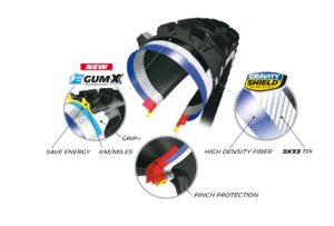 In aggiunta al lavoro svolto sulla carcassa, gli ingegneri Michelin si sono concentrati sullo sviluppo delle mescole dando vita all’ultima generazione di E-GumX che consente una trasmissione eccezionale della potenza a terra,applicata al pedale attraverso la ruota posteriore, migliorando allo stesso tempo la durata di vita del battistrada.