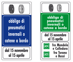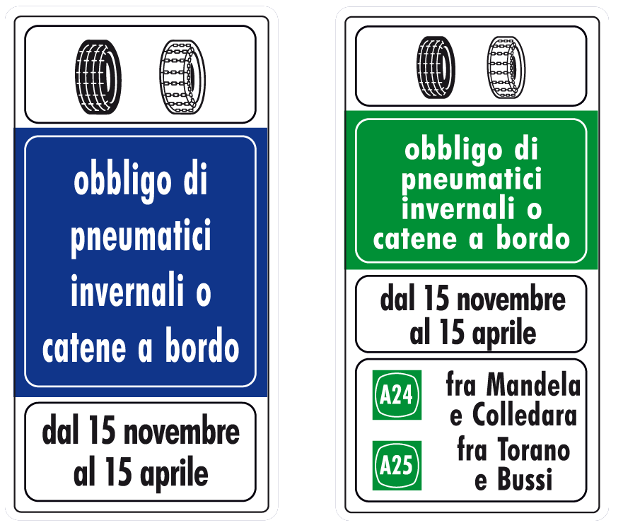 Sulle strade interessate da specifiche ordinanze è previsto — dal 15 novembre al 15 aprile — l’obbligo di circolare con pneumatici invernali montati oppure, in alternativa, di avere catene o calze da neve a bordo; la norma riguarda gli autoveicoli. Per i motocicli non è previsto l’obbligo, ma in caso di previsione di neve o ghiaccio al suolo la loro circolazione è vietata.