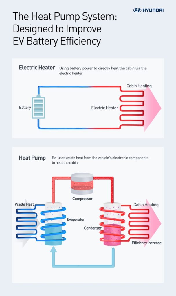 La tecnologia è stata introdotta per la prima volta nel 2014 sulla prima generazione di Kia Soul EV. Composta da un compressore, un evaporatore e un condensatore, la pompa di calore catturava il calore residuo emesso dai componenti elettrici del veicolo, riciclando questa energia per riscaldare l’abitacolo in modo più efficiente. In questo modo i 180 km di autonomia di guida del modello erano salvaguardati anche con rigide condizioni climatiche. Questa tecnologia, già leader nel settore delle pompe di calore, è stata ora ulteriormente sviluppata per i nuovi veicoli elettrici di Hyundai e Kia. Il nuovo sistema utilizza il calore disperso da un numero maggiore di fonti per una ottimizzazione dell’autonomia a basse temperature.