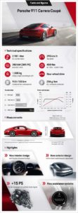 Come nel caso della Carrera S, il motore, il telaio e i freni sono stati studiati per garantire una sportività esclusiva. Il propulsore sei cilindri boxer da 3.0 litri della 911 Carrera genera potenza essenzialmente attraverso i giranti di diametro ridotto delle turbine e dei compressori che caratterizzano le nuove unità turbo. La trasmissione di potenza viene gestita mediante il nuovo cambio a doppia frizione Porsche (PDK) a otto marce, consentendo alla 911 Carrera Coupé di accelerare da 0 a 100 km/h in 4,2 secondi e di raggiungere una velocità massima di 293 km/h. Il pacchetto opzionale Sport Chrono riduce di altri 0,2 secondi il tempo di accelerazione. Il consumo di carburante sul ciclo misto (secondo il ciclo NEDC correlato) della Coupé è pari a 9,0 l/100 km, mentre per la Cabriolet è di 9,2 l/100 km.