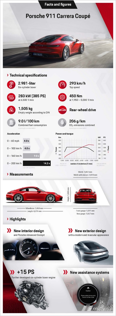 La famiglia 911 dà il benvenuto a un nuovo membro: Porsche amplia la gamma, giunta all’ottava generazione, con la nuova 911 Carrera. La nuova sportiva, che viene lanciata in versione Coupé e Cabriolet, monta un motore sei cilindri boxer biturbo da 3.0 litri che sviluppa 283 kW (385 CV) di potenza. La Carrera è il modello d’ingresso della gamma 911 ed eroga 11 kW (15 CV) di potenza in più rispetto al suo predecessore. Le sue dotazioni standard di eccellente qualità risultano praticamente invariate rispetto a quelle della 911 Carrera S e includono interni di alta qualità con schermo touch da 10,9 pollici, connettività completa e innovativi sistemi di assistenza alla guida come, ad esempio, il Porsche Wet Mode, la modalità che garantisce una manovrabilità dell’auto ancora più sicura sulle strade con fondo bagnato.