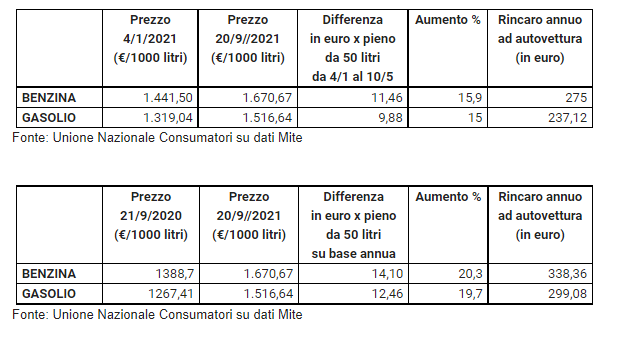 “In un anno, dalla rilevazione del 21 settembre 2020, quando la benzina era pari a 1.389 euro al litro e il gasolio a 1.267 euro al litro, un pieno da 50 litri costa 14 euro e 10 cent in più per la benzina e 12 euro e 46 cent in più per il gasolio, con un rialzo, rispettivamente, del 20,3% e del 19,7%. Un rincaro dei prezzi carburanti che equivale, su base annua, a una mazzata pari a 338 euro all’anno per la benzina e a 299 euro per il gasolio” ha concluso Massimiliano Dona.