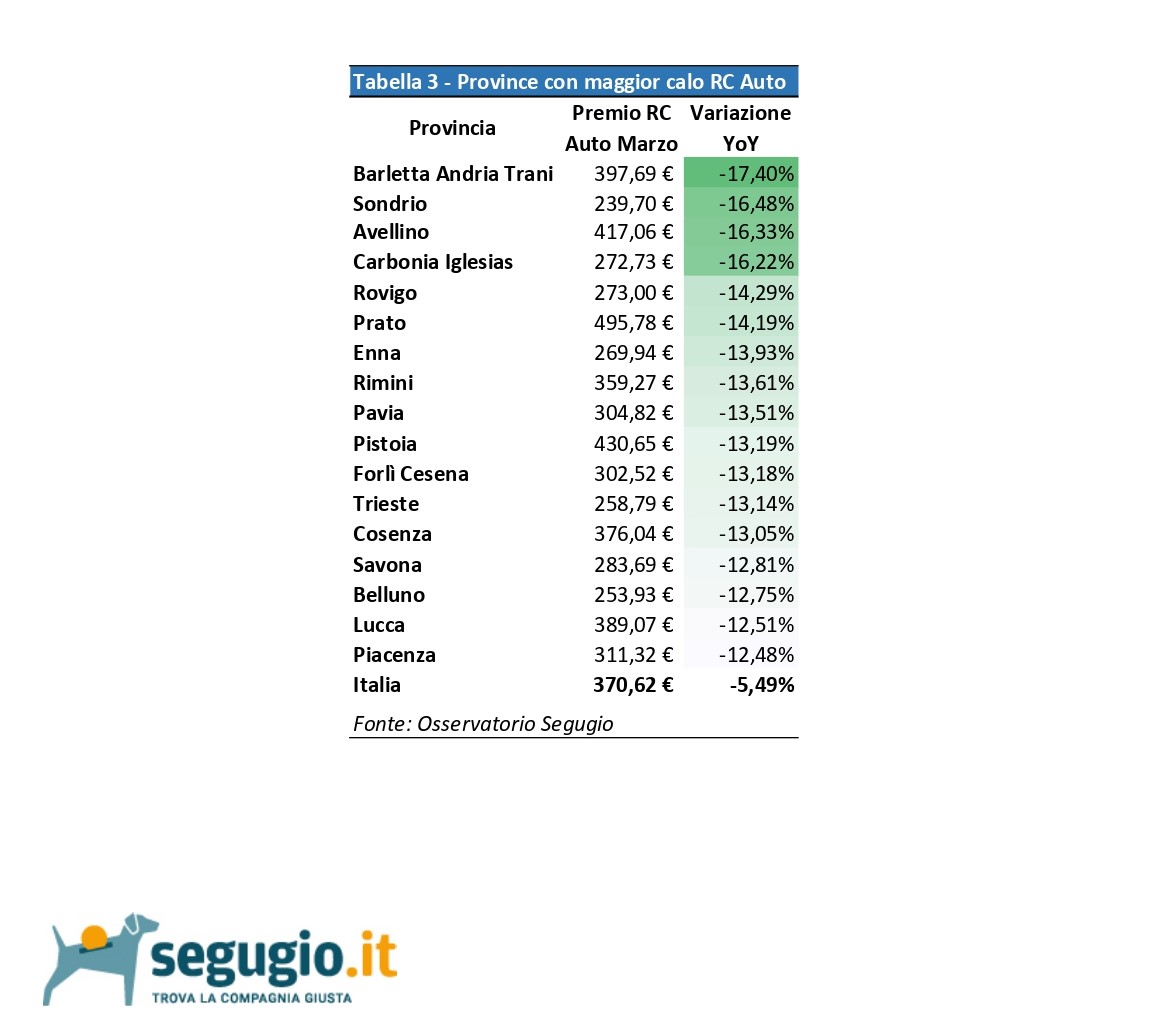 un +7,7%. Tra le altre, risaltano Napoli e Caserta, due province campane caratterizzate da un premio medio molto elevato, dove si registra un aumento del 5,2% e del 4,2%; - Le tre Province in cui il premio RC Auto è sceso maggiormente sono Barletta-Andria-Trani, con un -17,4%, Sondrio, (-16,5%) e Avellino (-16,3%).