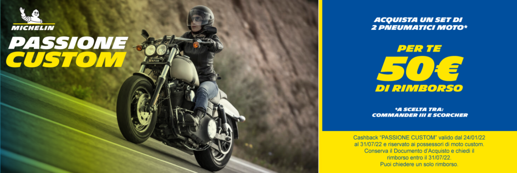 Michelin ha attivato la promozione Moto “Passione Custom”, valida a partire dal 24 gennaio e fino al 31 Luglio 2022: i motociclisti che si sono registrati presso lo stand Michelin durante la fiera Motor Bike Expo di Verona e che acquisteranno almeno un set di 2 pneumatici moto Michelin Commander III o Scorcher riceveranno un rimborso cashback di 50 €.