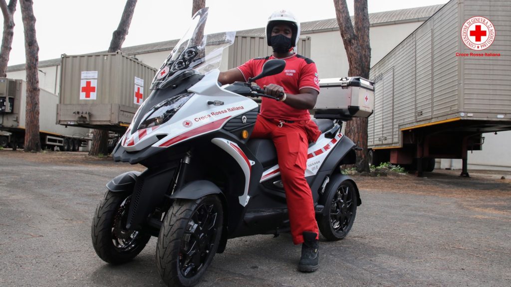 Qooder, il quattro ruote, che piega come una moto ed è sicuro come un’auto, veste quindi la divisa della Associazione benefica ed è già entrato in servizio dei volontari e degli operatori della Croce Rossa Italiana.