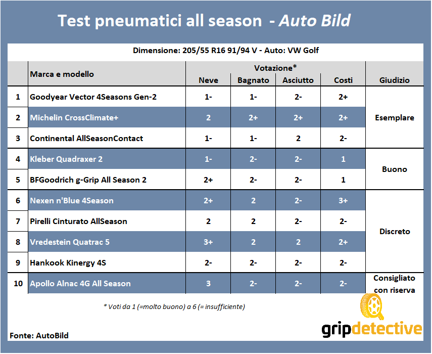 I 10 a passare la prova e a venire successivamente esaminati in modo più approfondito sono: Goodyear Vector 4Seasons Gen-2, Michelin CrossClimate+, Continental AllSeasonContact, Kleber Quadraxer 2, BFGoodrich g-Grip All Season 2, Nexen N’Blue 4Season, Pirelli Cinturato AllSeason, Vredestein Quatrac 5 e Hankook Kinergy 4S. Questi sono i migliori pneumatici all season. Andiamo a vedere insieme le loro caratteristiche
