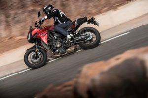 Decidiamo di iniziare sulla Tracer 700. Oggi l’itinerario sarà ovviamente tutto su asfalto, lungo un percorso di circa 325 km che calcherà, ad inizio e fine test, una parte del tratto stradale già percorso nel test degli A41, snodandosi sempre nell’area di Ouarzazate. La conoscenza della strada maturata nella giornata di test delle coperture adventure-tourer ed il tempo di riscaldamento quasi nullo T31, consentono di mettere alla frusta da subito le nuove nate della casa giapponese.