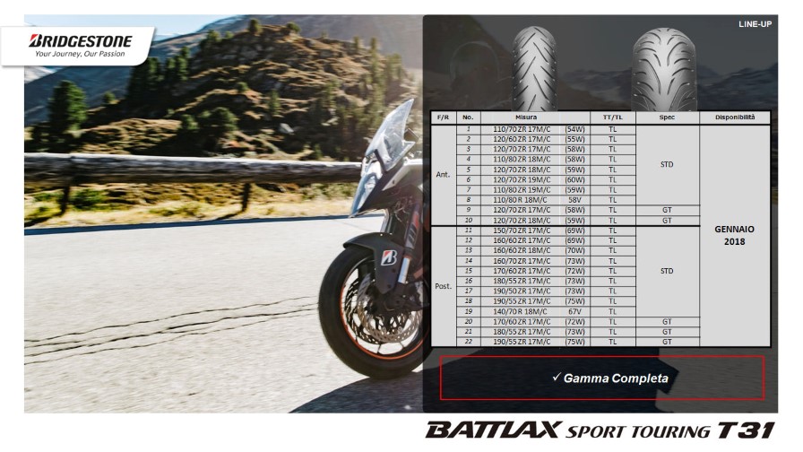 Sono ben 22, le diverse misure con le quali il Bridgestone Battlax Sport Touring T31 è disponibile sul mercato. Per l’anteriore ne sono previste 10, che spaziano dai 17 ai 19 pollici di diametro, per larghezze di 110 e 120. Due di esse vengono prodotte nella variante GT, specificatamente dedicata alle grosse sport-tourer. Per il posteriore le misure sono 12 e vanno dai 150/70 ZR17 ai 190/55 ZR17 con, in questo caso, tre misure in specifica GT.