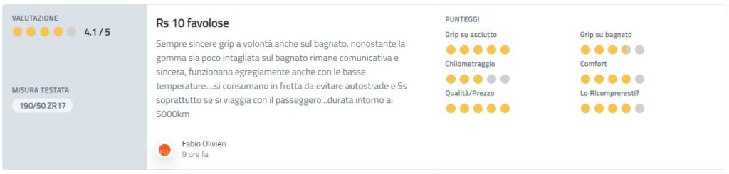 Recensioni Bridgestone RS10 ? Si, ne abbiamo! Qui ne trovate una di un nostro GripDetective che le definisce “favolose”. Se volete leggere tutte le recensioni Bridgestone RS10 e postare le vostre, cliccate nel link in basso.