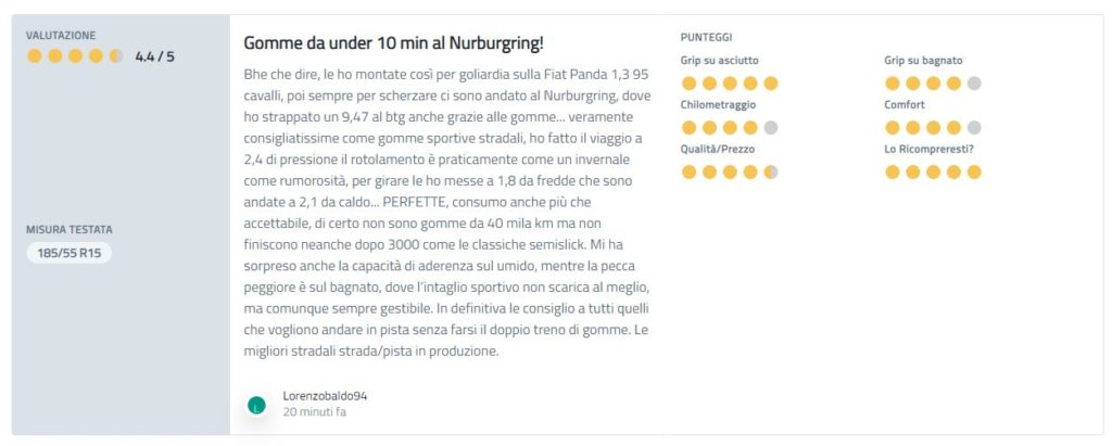 Bhe che dire, le ho montate così per goliardia sulla Fiat Panda 1,3 95 cavalli, poi sempre per scherzare ci sono andato al Nurburgring, dove ho strappato un 9,47 al btg anche grazie alle gomme… veramente consigliatissime come gomme sportive stradali, ho fatto il viaggio a 2,4 di pressione il rotolamento è praticamente come un invernale come rumorosità, per girare le ho messe a 1,8 da fredde che sono andate a 2,1 da caldo… PERFETTE, consumo anche più che accettabile, di certo non sono gomme da 40 mila km ma non finiscono neanche dopo 3000 come le classiche semislick. Mi ha sorpreso anche la capacità di aderenza sul umido, mentre la pecca peggiore è sul bagnato, dove l’intaglio sportivo non scarica al meglio, ma comunque sempre gestibile. In definitiva le consiglio a tutti quelli che vogliono andare in pista senza farsi il doppio treno di gomme. Le migliori stradali strada/pista in produzione.