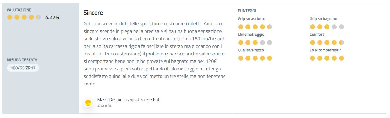 © riproduzione riservataGià conoscevo le doti delle sport force così come i difetti . Anteriore sincero scende in piega bella precisa e si ha una buona sensazione sullo sterzo solo a velocità ben oltre il codice (oltre i 180 km/h) sarà per la solita carcassa rigida fa oscillare lo sterzo ma giocando con l idraulica ( freno estensione) il problema sparisce anche sullo sporco si comportano bene non le ho provate sul bagnato ma per 120€ sono promosse a pieni voti aspettando il kilomettaggio mi ritengo soddisfatto quindi alle due voci metto un tre stelle ma non tenetene conto.